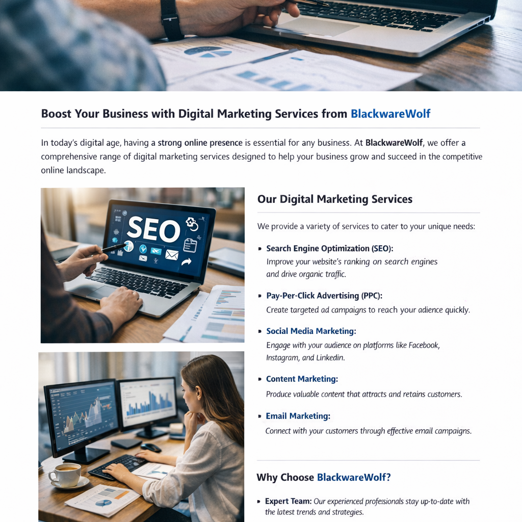By BlackwareWolfBoost Your Business with Digital Marketing Services from BlackwareWolfIn today’s fast‑paced digital age, having a strong online presence is no longer optional—it’s essential. Whether you’re a startup trying to establish credibility or a growing enterprise aiming to expand your reach, digital marketing is the key to connecting with your audience. At Black ...